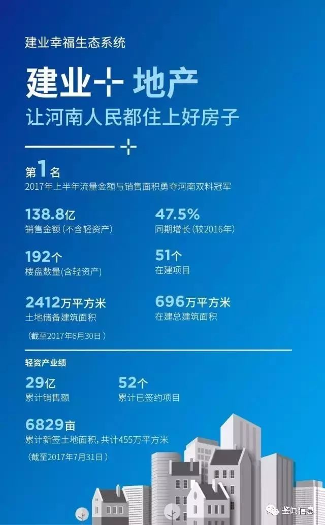 在億翰智庫發布的2017年1-7月中國典型房企銷售業績TOP200中,建業地產以172.8億元的銷售額和281.1萬的銷售面積,拿下2017上半年河南房企“雙料冠軍”。