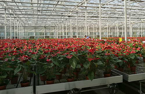 4月8日,在位于河南省鄢陵花木旅游產業集聚區建業綠色基地內,工作人員正在智能聯棟溫室內管理荷蘭紅掌盆花(圖1)。鄢陵建業綠色基地是建業集團第一個現代農業綜合體項目,目前已建成智能聯棟溫室8棟,總面積6萬㎡,綜合展廳及研發中心5000㎡。溫室內主要種植荷蘭紅掌盆花、荷蘭紅掌鮮切花,丹麥木槿盆花,丹麥長壽花盆花,荷蘭彩色番茄等10余個高端花卉果蔬品種。此外,基地園區內還建設有親子樂園、萌寵樂園、老紅湯鄉茶館、建業大食堂、休閑垂釣區等休閑主題功能區。