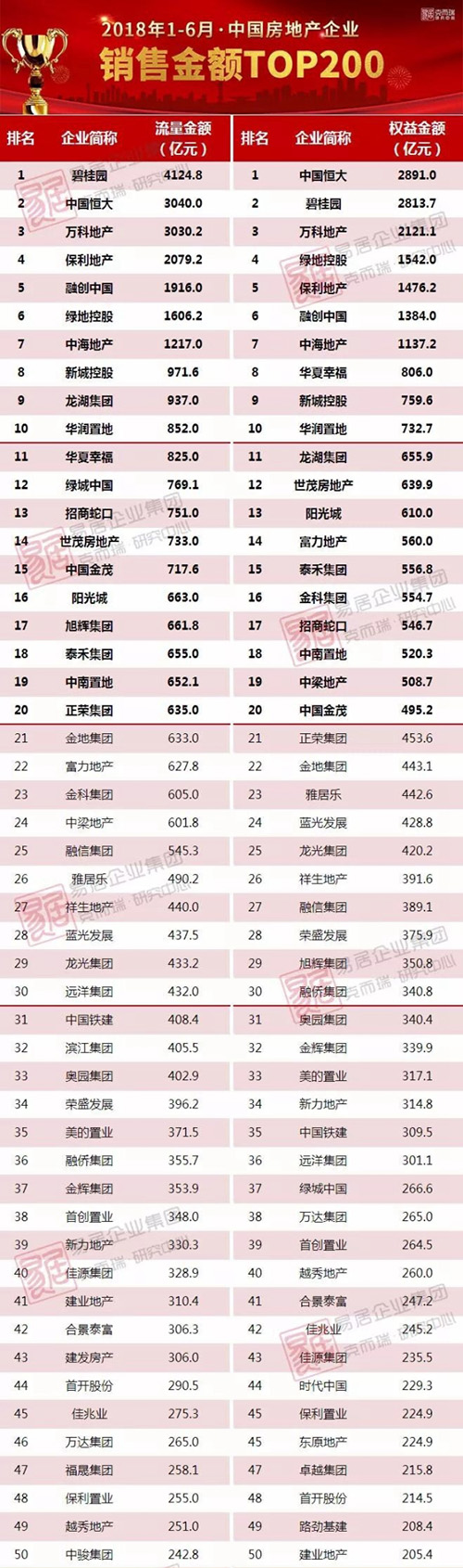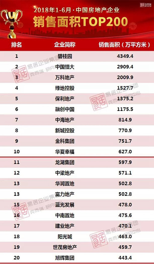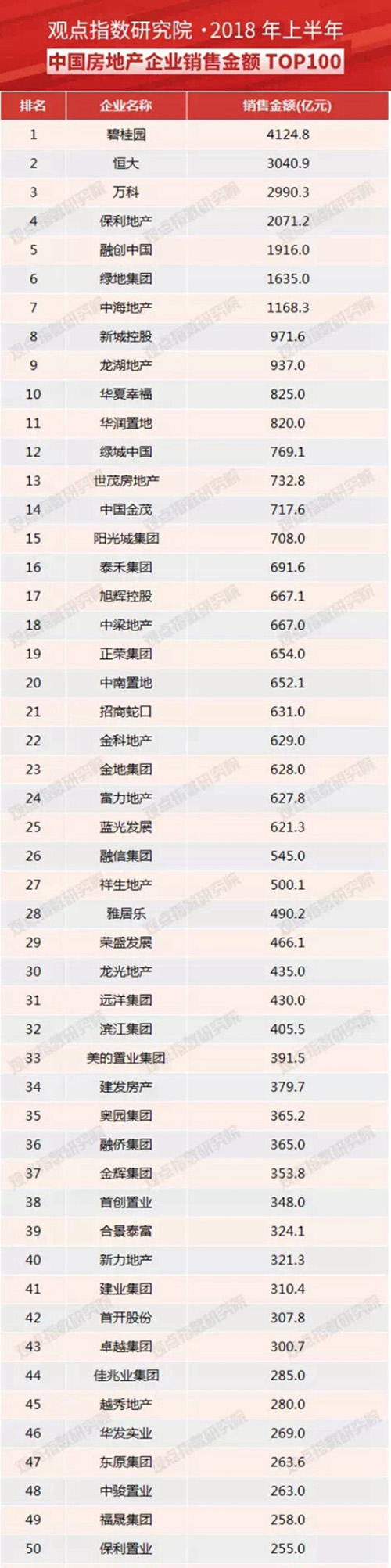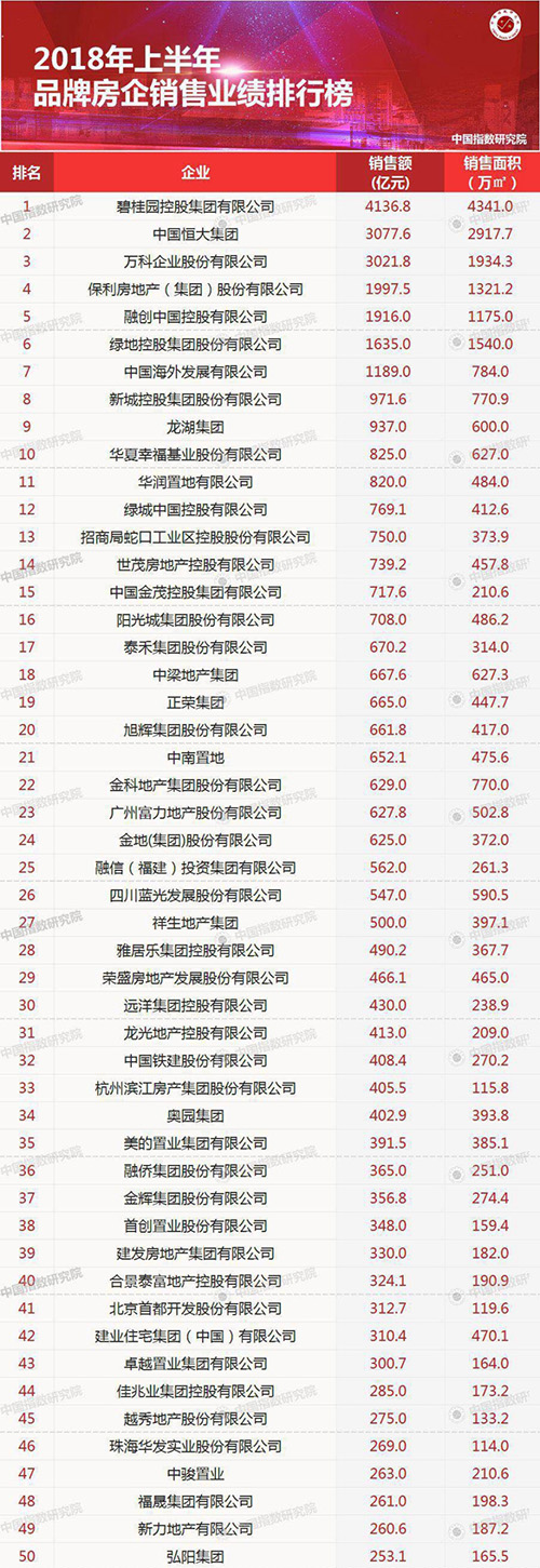 中指數發布“2018年上半年品牌房企銷售業績排行榜”