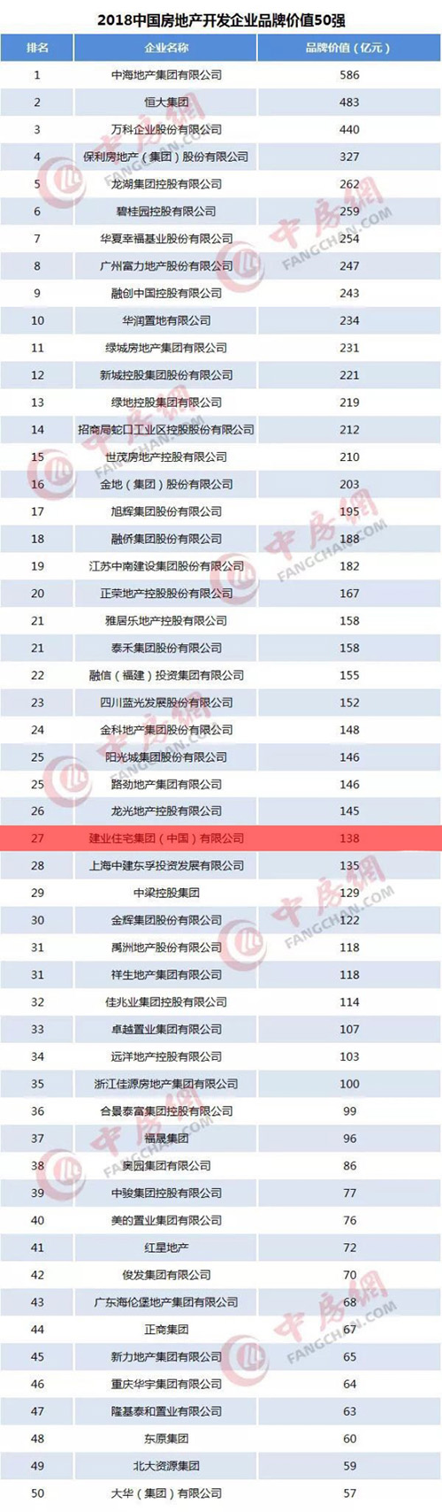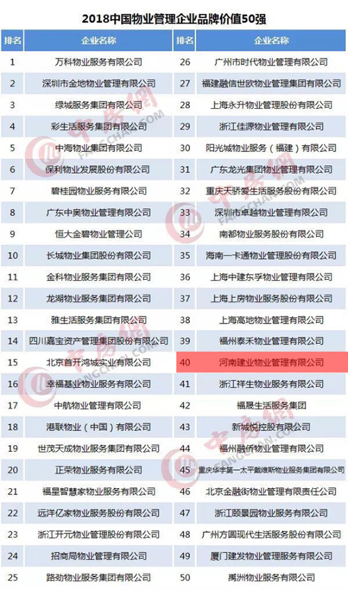9月18日,“2018中國房地產(chǎn)企業(yè)品牌發(fā)展高峰論壇暨房企品牌價(jià)值測評(píng)成果發(fā)布會(huì)”在杭州舉行,會(huì)上發(fā)布了2018中國房地產(chǎn)開發(fā)企業(yè)品牌價(jià)值50強(qiáng)、區(qū)域10強(qiáng)、物業(yè)管理企業(yè)品牌價(jià)值50強(qiáng)等榜單,建業(yè)集團(tuán)及建業(yè)物業(yè)實(shí)力入榜,分別榮獲2018中國房地產(chǎn)開發(fā)企業(yè)品牌價(jià)值第27名,較往年名次晉升一位,物業(yè)管理企業(yè)品牌價(jià)值第40名。