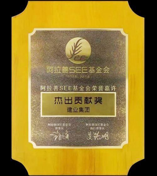 阿拉善SEE基金會集結了一大批有責任、有情懷的企業家在環保的路上進行引領和帶頭示范。此次公益之夜中,設置了“捐贈人答謝”環節,過去十年中,建業集團持續在阿拉善SEE基金會進行捐贈、累計金額已超百萬,因而獲得了“杰出貢獻獎”的殊榮。