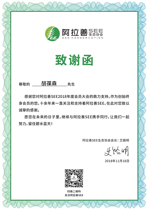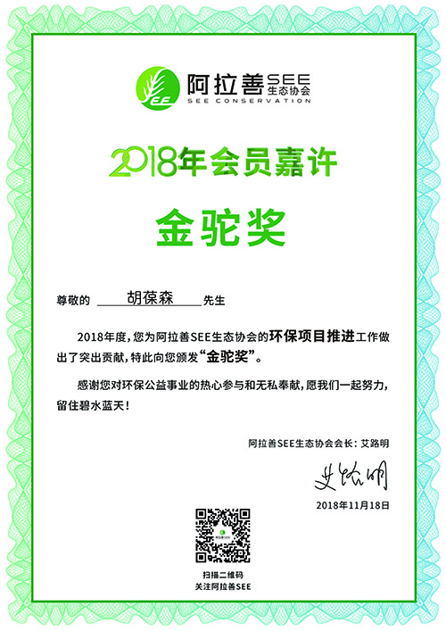 在次日的阿拉善SEE會員大會的年度會員嘉許環節,因胡董在環保項目推進方面的積極貢獻,大會為胡董頒發“金駝獎”。因胡董支持此次阿拉善SEE的十周年公益之夜及年度會員大會的舉辦召開,阿拉善SEE生態協會會長艾路明特別為胡董頒發致謝函,代表所有與會會員表達對胡董的感謝之情。