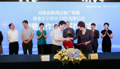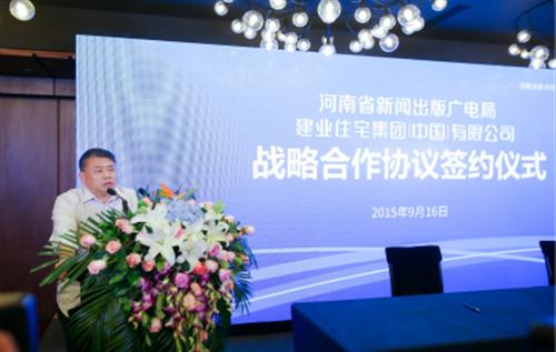 2015年9月16日,建業集團與河南省新聞出版廣電局戰略合作簽約儀式在鄭州建業艾美酒店成功舉行。省委宣傳部副部長,省新聞出版廣電局(河南省版權局)黨組書記、局長朱夏炎,建業集團董事長胡葆森,建業集團執行總裁劉大勇,省新聞出版廣電局巡視員宋鳳仙,省新聞出版廣電局黨組副書記、副局長姚進忠等雙方主要領導及多家省內外媒體、自媒體匯聚一堂,共同見證這一重要時刻。