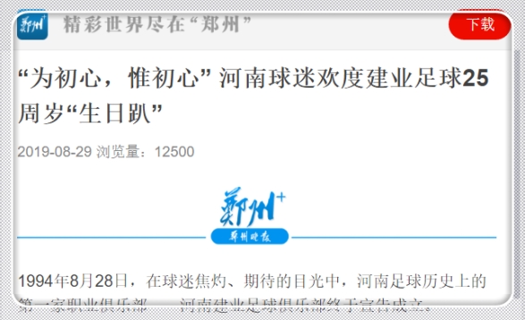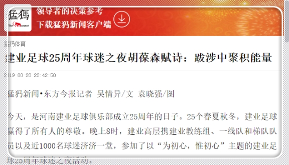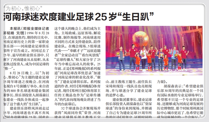 2019年8月28日,“為初心,惟初心——建業(yè)足球25周年球迷之夜”于河南電視臺(tái)8號(hào)演播廳燃情舉辦,建業(yè)集團(tuán)董事長(zhǎng)胡葆森、省市體育局領(lǐng)導(dǎo)、足協(xié)領(lǐng)導(dǎo)、32個(gè)球迷協(xié)會(huì)的球迷代表、國(guó)內(nèi)及省內(nèi)知名媒體人、800個(gè)現(xiàn)場(chǎng)球迷及直播平臺(tái)的300萬(wàn)建業(yè)球迷,共同見(jiàn)證了建業(yè)足球25年的風(fēng)雨之路和光陰故事。晚會(huì)通過(guò)PP體育、今日頭條、建業(yè)足球APP、建業(yè)足球TV等平臺(tái)觀看網(wǎng)絡(luò)直播的人次近70萬(wàn),微博熱搜#我們的河南驕傲#話題閱讀量1500萬(wàn)人次。晚會(huì)已于9月3日21:30在河南廣播電視臺(tái)都市頻道首播,與9月14日10:25在河南衛(wèi)視播出。同時(shí),建業(yè)足球25周年專題紀(jì)錄片《堅(jiān)韌·25年》于9月16日12:35在CCTV5播出。