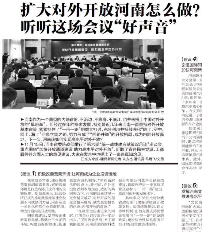 11月15日,河南省委統(tǒng)戰(zhàn)部舉行了第六期“統(tǒng)一戰(zhàn)線建言獻策雙月談”座談會,重點圍繞“加快開放通道建設 助力高水平對外開放”,聽取了省各民主黨派、工商聯(lián)等各方面人士的意見建議,大家在發(fā)言中也提出了一條條真知灼見。