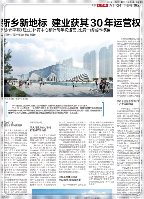 11月26日記者獲悉,一個占地約349.8畝,建筑面積約104000㎡,足以比肩一線城市體育中心標準的城市新地標——新鄉市平原(建業)體育中心已于近日正式落成,預計將于明年年初正式投入運營,而建業獲得該體育中心30年運營權,這也意味著河南省的大型現代化體育設施再添一名新成員。