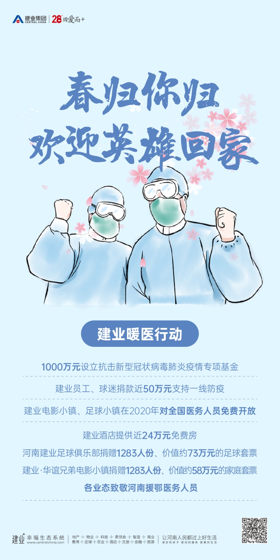 春歸,你歸!歡迎英雄回家!3月17日晚,河南支援湖北醫療隊首批98名隊員平安到家!建業集團各業態發起一系列暖醫行動支持一線醫務人員,盡己所能溫暖最美逆行者。