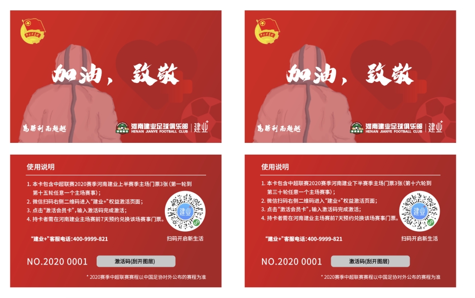 提供球票,我可以!河南建業足球俱樂部提供總價值約73萬元的愛心球票,將通過河南省青少年發展基金會為1283位河南援鄂醫務人員統一發放(每人一場,一場3張)。