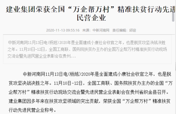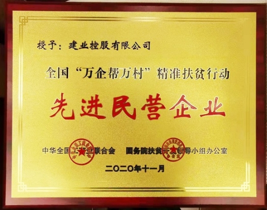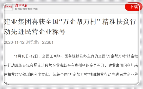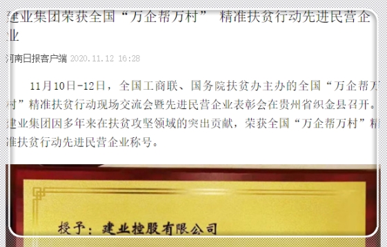 11月10日-12日,全國工商聯、國務院扶貧辦主辦的全國“萬企幫萬村”精準扶貧行動現場交流會暨先進民營企業表彰會在貴州省織金縣召開。建業集團因多年來在扶貧攻堅領域的貢獻,榮獲全國“萬企幫萬村”精準扶貧行動先進民營企業稱號。