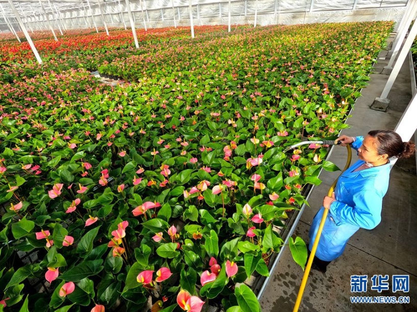 2021.1.17 河南鄢陵建業綠色基地,員工在智能聯棟溫室大棚內管理荷蘭紅掌。