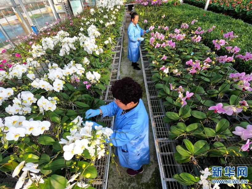 2021年1月17日,河南鄢陵建業綠色基地,員工在智能聯棟溫室大棚內管理蝴蝶蘭。