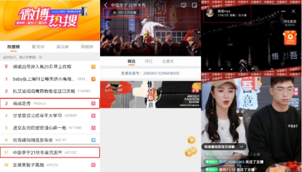 4月7日,中國李寧2021秋冬潮流發(fā)布在《只有河南·戲劇幻城》盛大舉辦!100余名超模、50余位藝人嘉賓到場,這場融合走秀、現(xiàn)場表演、潮流派對為一體的沉浸式體驗空間對話,在中原腹地震撼上演!各平臺線上直播觀看量超3784萬人次,相關話題登上微博熱搜第3位、第17位。