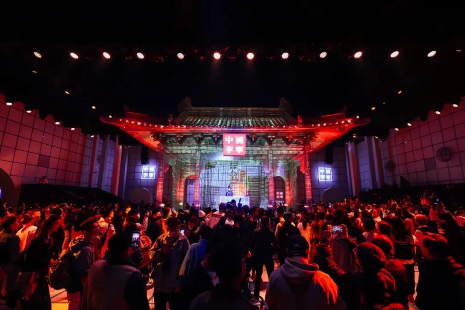 秀場內光影映襯,虛實相融。科技感的燈光視覺藝術將這里打造成虛擬的棋盤格狀,一座鋼結構、鏤空工藝的銀絲古建,仿佛連接歷史與未來的橋梁,在藝術與潮流中融入東方智慧的哲思,每一點表達都在詮釋著“無創(chuàng)造無意義”。秀場外眾星打卡,競相留影。充滿戲劇感的椅陣,從中間座位延續(xù)到西側城墻,好似時空折疊;長達324米的黃色夯土墻,樸實而厚重、傳統(tǒng)又未來。這些吸睛又出片兒的場景設計,來了,就無法抗拒~