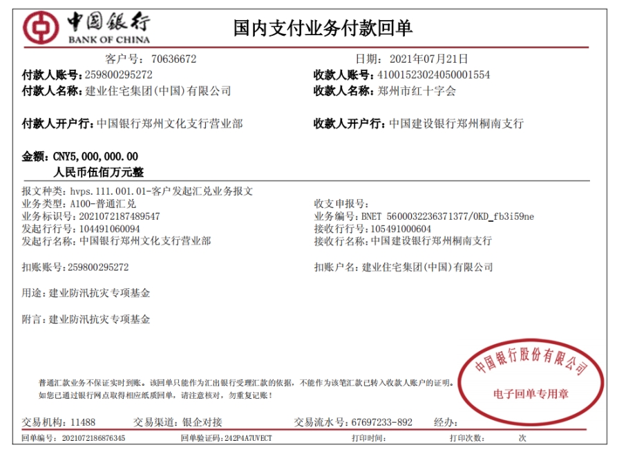 建業集團向鄭州市紅十字會捐贈現金500萬元設立“建業防汛抗災專項基金”,并同時采購救援物資支持受災地區與群眾。