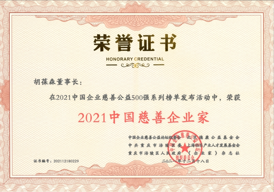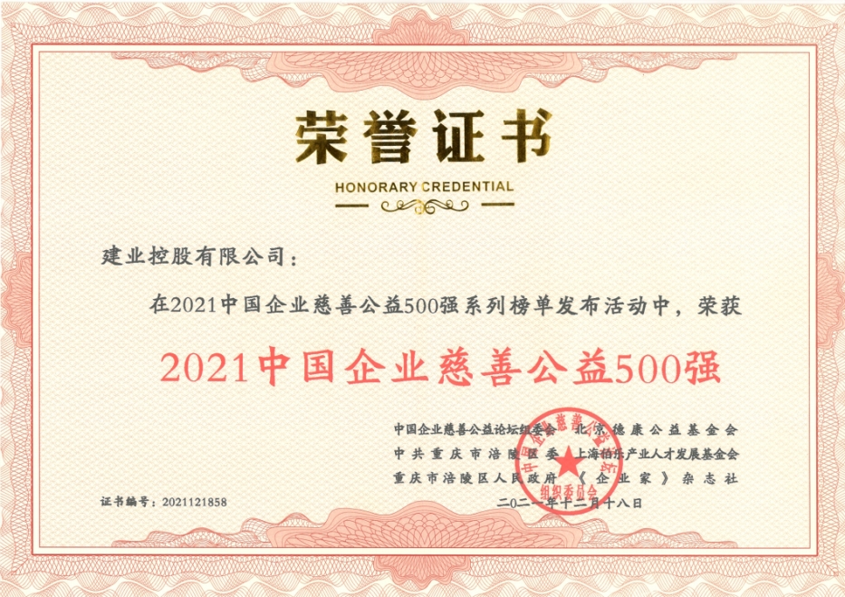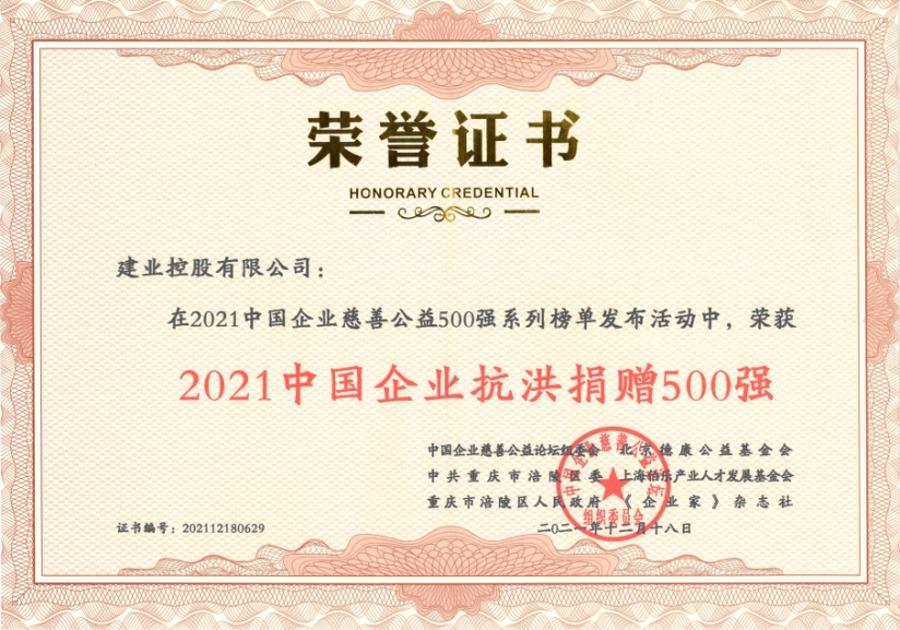 建業集團榮獲“2021中國企業慈善公益500強”和“2021中國企業抗洪捐贈500強”,建業集團董事長胡葆森榮獲“2021中國慈善企業家”榮譽稱號。